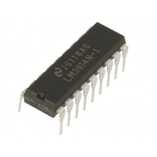 El LM3914N es un circuito integrado monolítico que sensa los niveles de voltaje analógico y controla 10 LEDs. Un simple pin cambia la configuración de display de punto a display de barra. La corriente que controla los LEDs es regulada y programable, eliminando la necesidad de resistores. Esta característica es la que permite el funcionamiento de todo el sistema con menos de 3V.