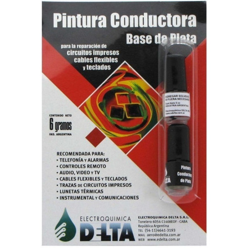 Pintura Conductora Base De Plata Delta 6 Gr Se utiliza para la reparacio de circuitos impresos, cables flexibles y teclados. Recomendada para: *Telefonia y alarmas *Control Remoto *Audio, tv, y video *Lunetas Termicas *Instrumental y Comunicaciones Para aplicaciones sobre vidrio, ceramicas, cabls planos, placas d circuitos impresos de epoxi y fenolicas, plasticos en general, ceramicas, gomas, etc.