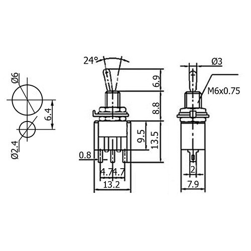 unipolar, terminales de soldadura, palanca corta; 6.9mm; ON-ON; SPDT 3P